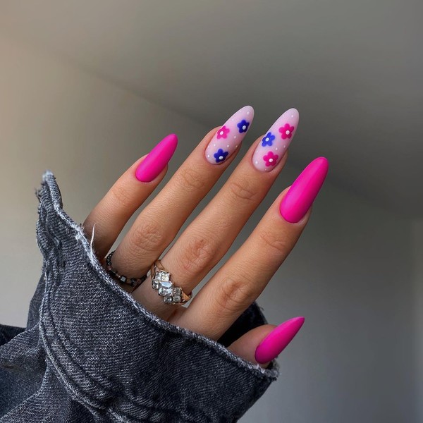 Квітковий принт – головний тренд літа, який можна повторити як із романтичними кульбабами, так і з елегантними гортензіями. Для такого манікюру з’єднайте яскраво-рожевий і синій – вийде ніжне поєднання, яке виглядає дуже красиво.