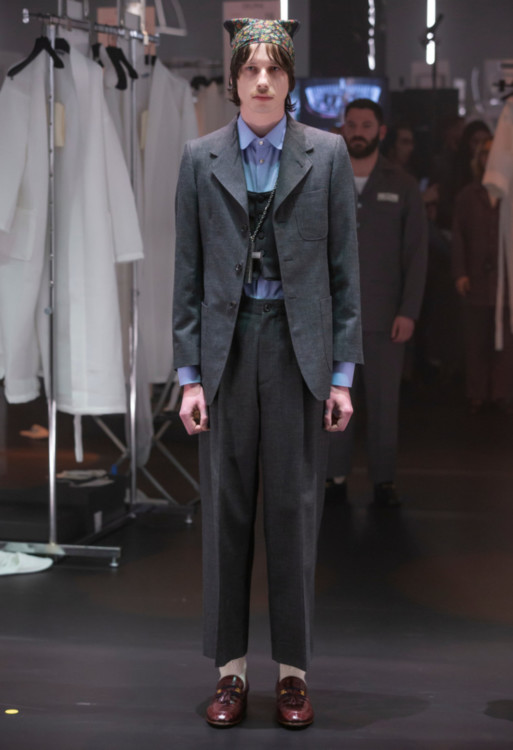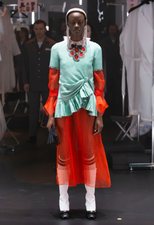 Тиждень моди в Мілані розпочався з вражаючого шоу Gucci. Алессандро Мікеле надав своїм гостям унікальний досвід – зазирнути за лаштунки шоу. Команда і моделі готувалися до показу на відкритій платформі, що обертається на 360 градусів. Кожен, хто прямував до подіуму, міг побачити, як створюються зачіски і макіяж, а також самого Мікеле, який контролює процес.