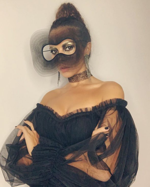 На опублікованому в Instagram фото вона позує в чорній сукні з глибоким декольте та об’ємними рукавами з сітки. Образ доповнили велика маска, сережки, чокер на шиї та яскравий макіяж у золотих тонах.