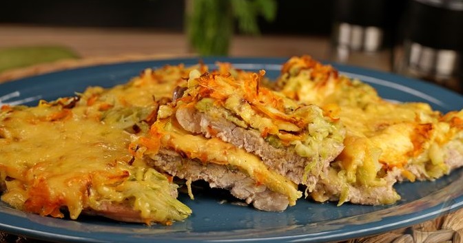 Свинячі відбивні, запечені з кабачком, морквою та сиром