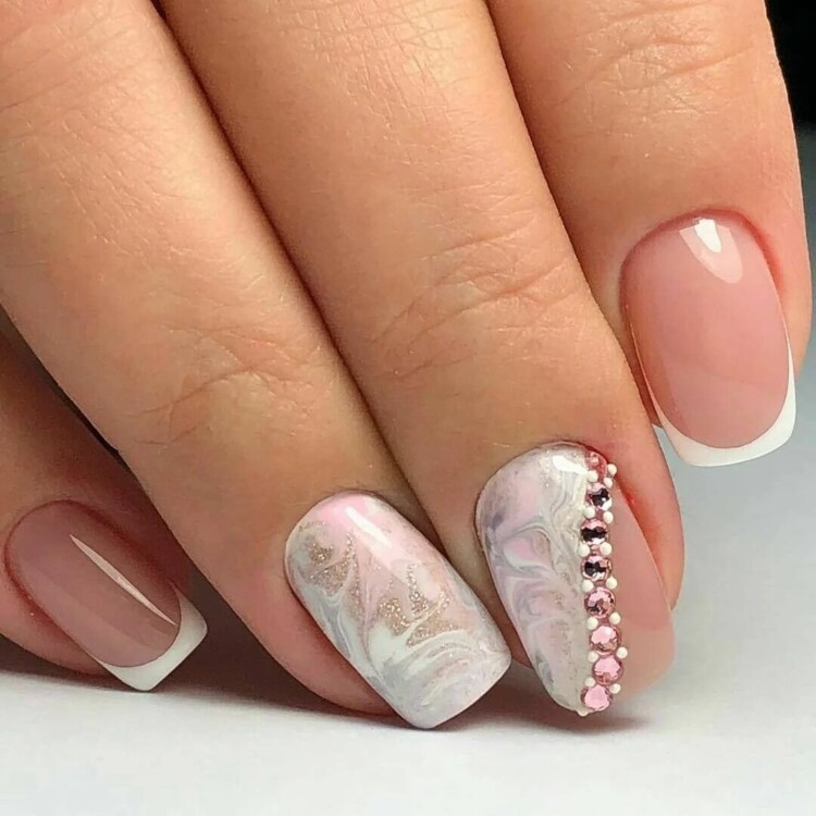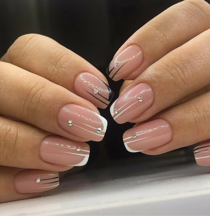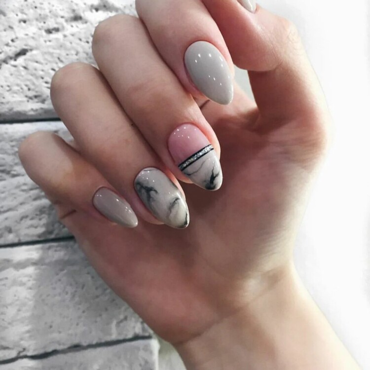 Ніжний класичний манікюр можна розбавити за допомогою чорного відтінку. Зробити кілька акцентів у вигляді мінімалізму. Особливо красиво виглядає манікюр з дизайном під мармур. Тут можна підібрати безліч цікавих колірних інтерпретацій. такий манікюр несе в собі ніжність, красу і неповторність. Також можна виконати такий дизайн поєднуючи темні і світлі відтінки.