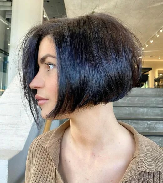 Простий боб з тонкими шарами на потилиці – одна з найлегших зачісок, яка не вимагає особливої укладання. Підійде для будь-якого волосся, навіть тонких і кучерявих.