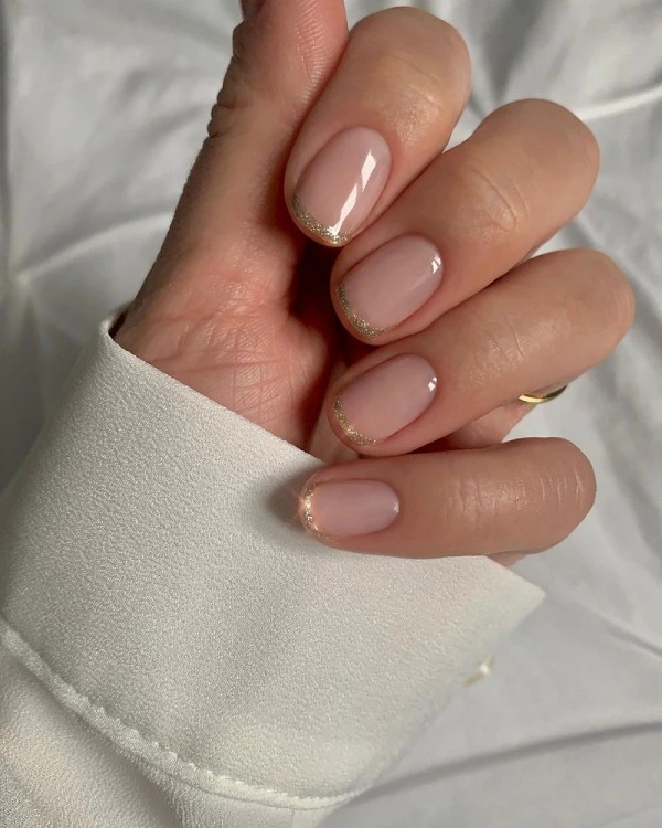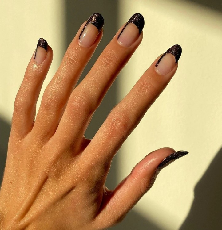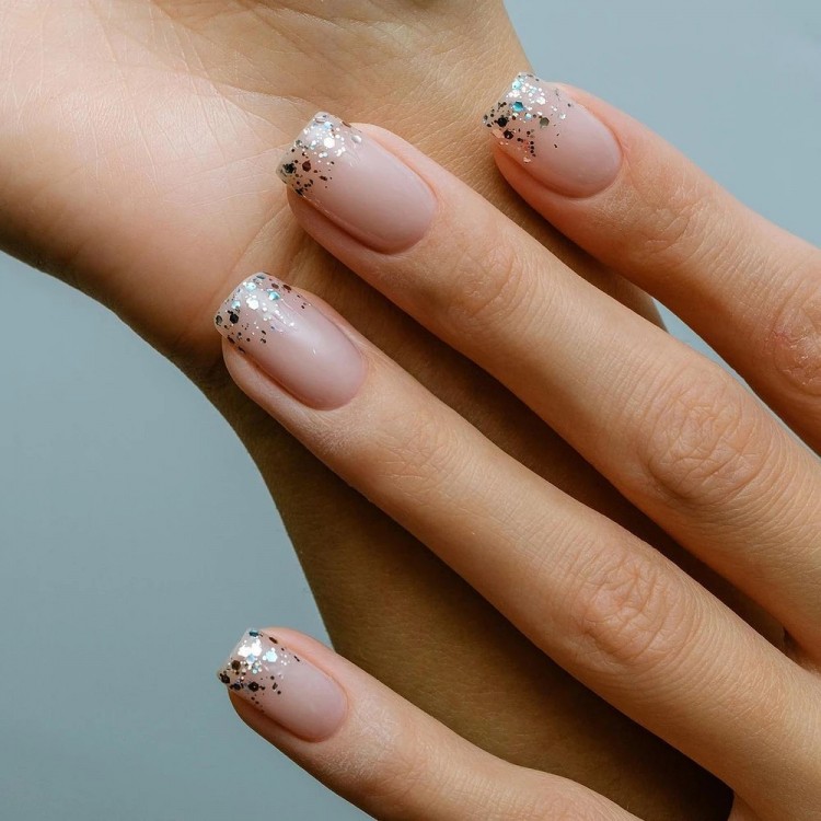 Ще варіант – зробити плавне омбре від блискучих частинок у краю до натурального нігтя біля зони росту.