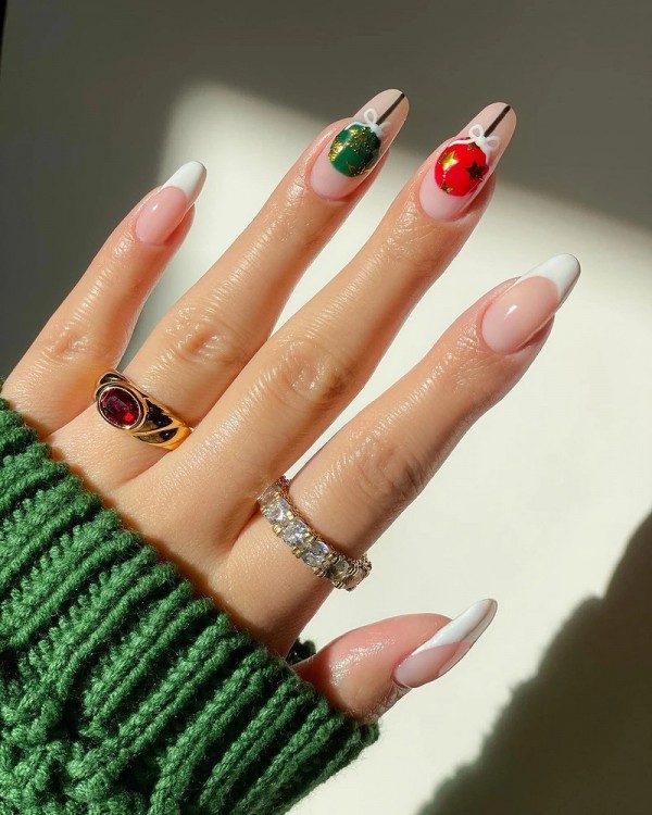 Новорічний манікюр 2022 року неможливо уявити без арту. Він може бути стриманим чи яскравим. Обидва варіанти користуються популярністю. У першому випадку ви вибираєте один або два базові кольори і наносите акцентні малюнки. Вони повинні бути тематично актуальними, але не додавати нігтям незграбності. Графічні лінії з бантами, делікатні ялинові гілочки, кульки, зірки — все повинно бути в міру.