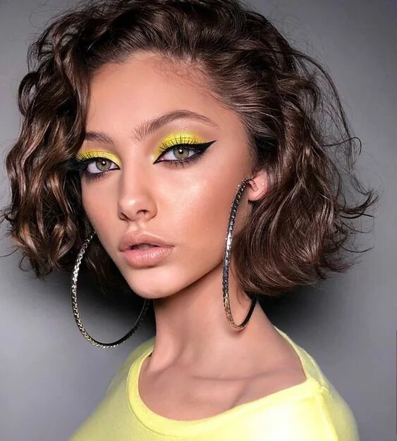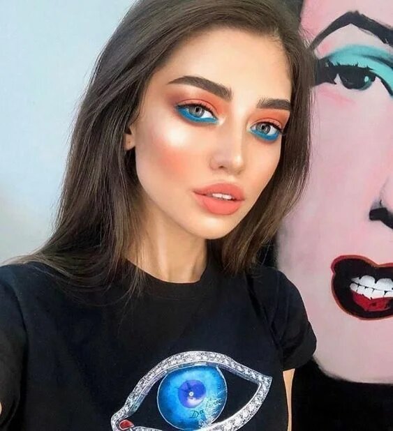 На повіки наносимо блискітки і гліттер. Виділяємо очі кольоровим підведенням, наклеюємо вії. Для того, щоб візуально збільшити очі – наносимо світлі тіні у внутрішній куточок очей.