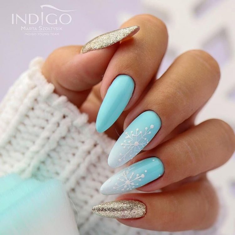 Ніжні блакитні відтінки чудово комбінуються із сріблястим лаком, крім того, на блакитному тлі красиво виглядають білі сніжинки будь-якого розміру.