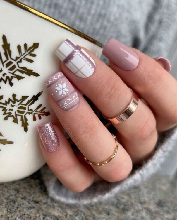 Любителькам мінімалістичного дизайну можна сміливо зробити манікюр, основою якого буде природний рожевий/бежевий, до якого можна додати пару ледь помітних сніжинок і трохи золотистого блиску.