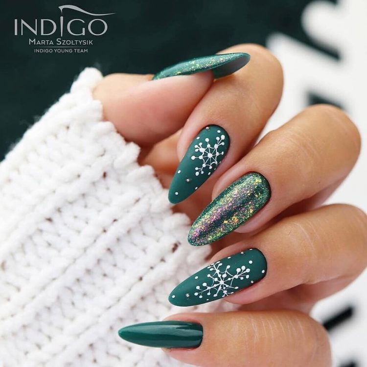 Всі відтінки зеленого кольору можна назвати ідеальним варіантом для новорічного манікюру 2024, але найкраще зупинити свій вибір на синьо-зелених та смарагдових тонах.