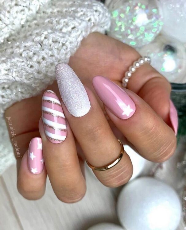 Топові місця незмінно займає манікюр у пастельно-рожевих тонах, що дозволяє виглядати доречно не лише новорічної ночі, а й щодня.