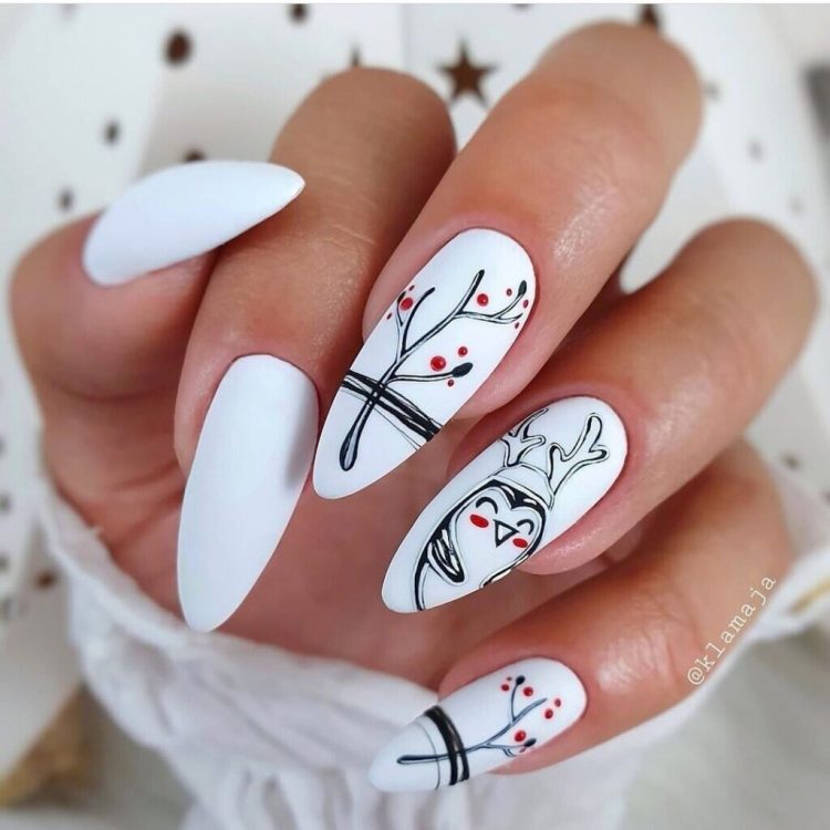 Манікюр у білих відтінках вважається традиційним для зимової пори року, і на тлі білого кольору можна створити безліч цікавих тематичних малюнків чи будь-який новорічний дизайн.