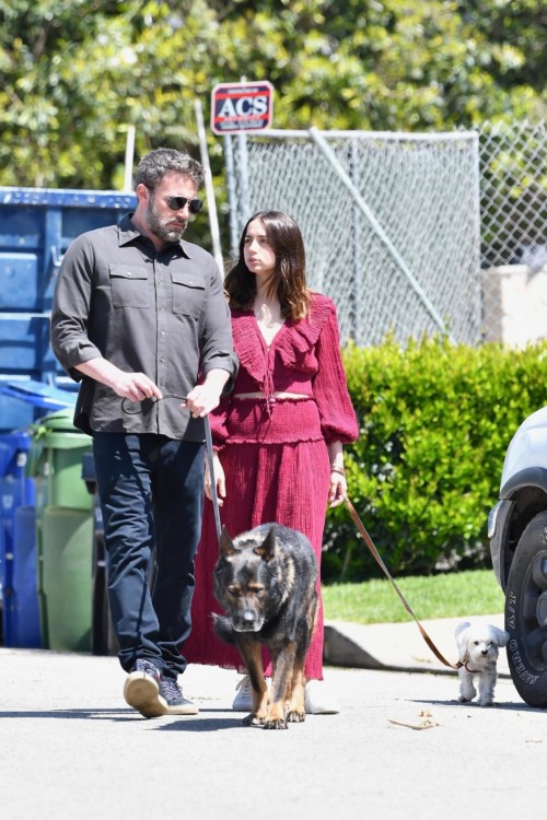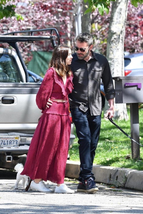 Закохана пара щодня потрапляє в об’єктиви репортерів під час прогулянки зі своїми собаками. Вчорашній день не став винятком. Для свого звичайного моціону з зупинками на обійми та поцілунки з Беном Ана вибрала спідницю і вкорочену сорочку в своєму улюбленому відтінку марсала й білі кеди.