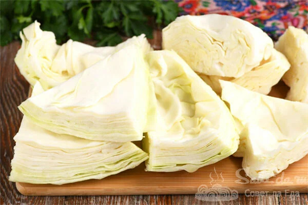 1. У великій каструлі розігріваємо воду і солимо. Капусту розрізаємо на великі шматки.