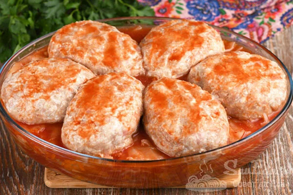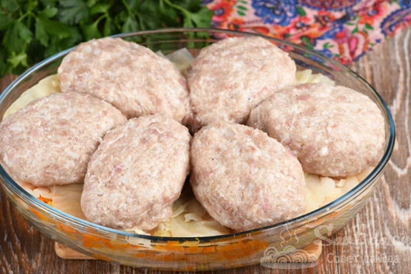 8. З підготовленого фаршу формуємо великі котлети (6 шт.) І розміщуємо їх на овочевій подушці.