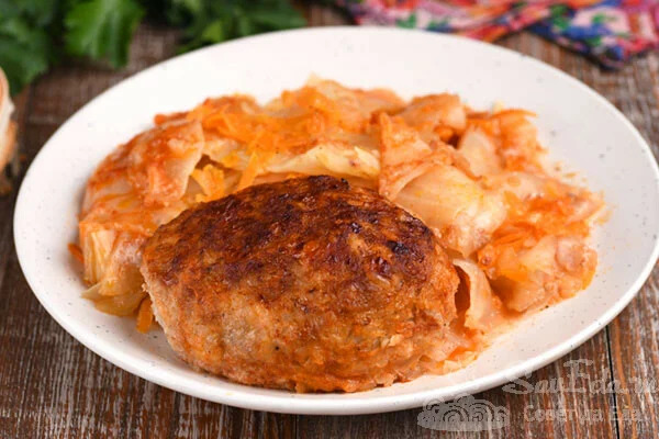 12. На тарілки розміщуємо котлети і поруч додаємо овочі. Капуста стає дуже м’якою, за рахунок соку від котлет і обсмажених овочів дуже смачною. Самі котлети виходять ніжними і ароматними. Овочі з м’ясом дають смак класичних голубців.