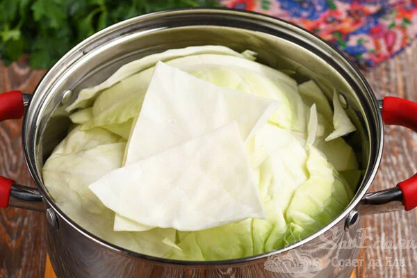 2. Капусту розділяємо на листки та викладаємо в киплячу воду. Готуємо після закипання близько 5 хвилин, поки лиски не стануть трохи м’якими. Потім перекладаємо їх на друшляк.