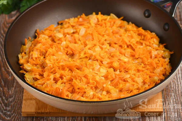3. Паралельно в сковороді в олії спочатку обсмажуємо дрібно нарізану цибулю. Потім додаємо крупно натерту моркву, вливаємо трохи води, спочатку тушкуємо, а потім обсмажуємо овочі, поки морква не стане м’якою.
