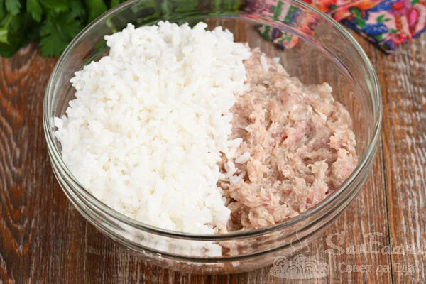4. Рис готуємо швидким способом. Промиваємо його, відправляємо в глибоку миску об’ємом 500 мл і вливаємо воду (пропорція: 1 частина рису і 2 частини води). Ставимо в мікрохвильовку, готуємо 5 хвилин, перемішуємо і ще 5 хвилин. Промиваємо і відразу в фарш. У нас домашній фарш (свинина + курка), в ньому є цибуля, сіль і перець. Все перемішуємо.