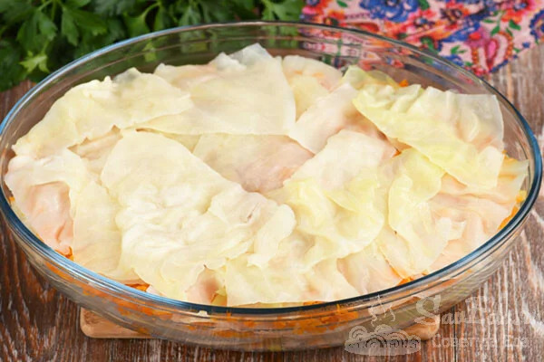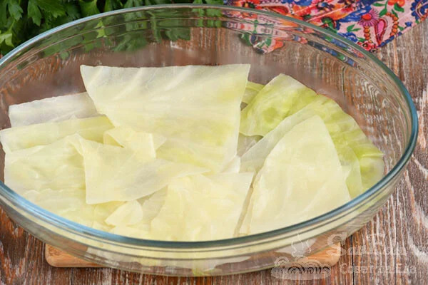 5. У велику форму на дно викладаємо підготовлені листки капусти (1/4 частина).