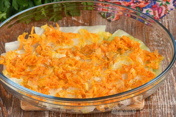 6. Зверху додаємо обсмажені овочі (1/3 частина), трохи солимо і перчимо.