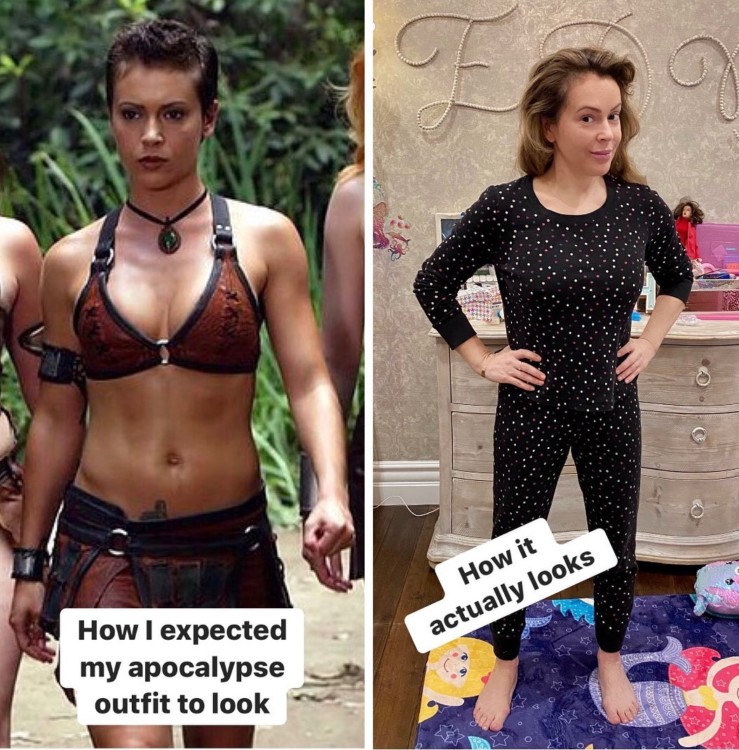 Днями зірка «Зачарованих» Алісса Мілано повеселила своїх підписників жартом про апокаліпсис. Актриса виклала колаж, на якому показала, як вона «планувала» виглядати при «кінці світу» і як це вийшло в реальності.