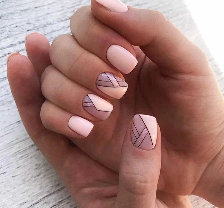 Геометричні форми залишаються у трендах. Вони стримані та лаконічні але, при цьому, виглядають стильно та оригінально. Можна прикрасити смужками, точками та трикутниками всі нігті або зробити акцент на одному або кількох нігтях.