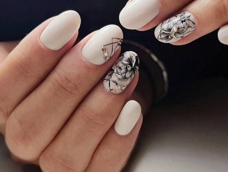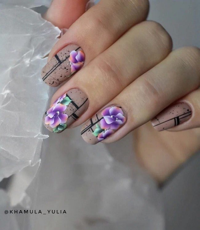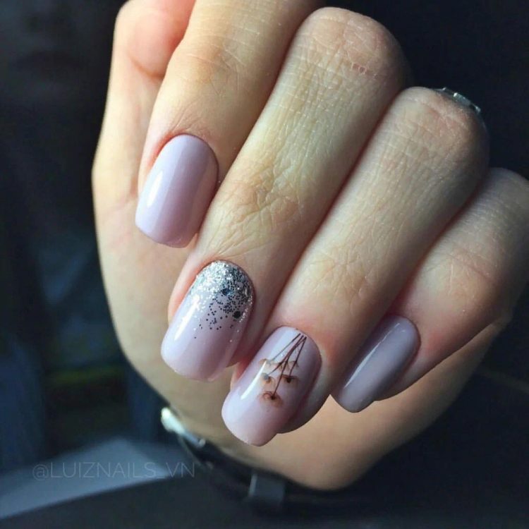 На нюдових кольорах лаку добре виглядають різні малюнки, нейтральні відтінки лише підкреслюють красу малюнка та особливості дизайну.