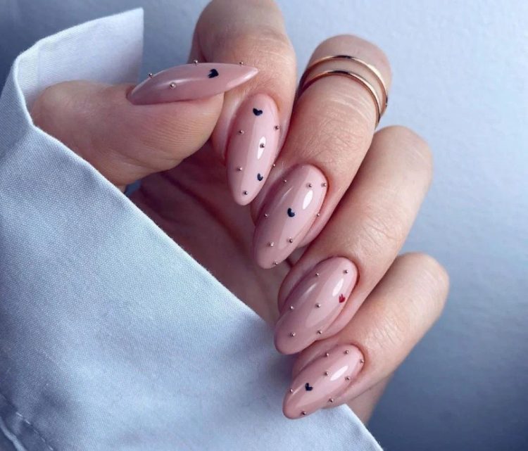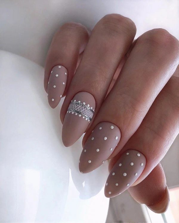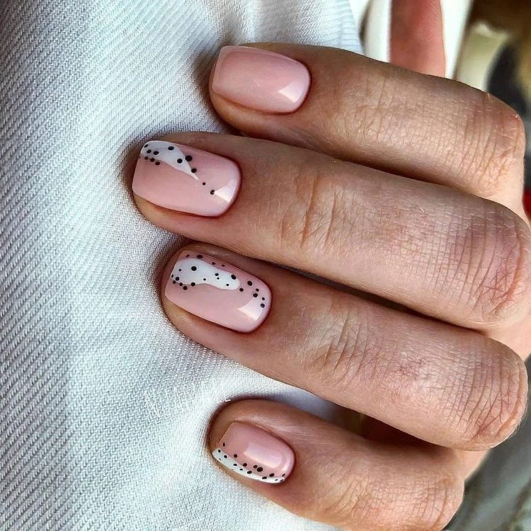Стильні цятки можуть стати модним доповненням вашого манікюру. У такому манікюрі за основу береться бежевий, кремовий або інший тон нюду і малюються чорні або кольорові крапочки.