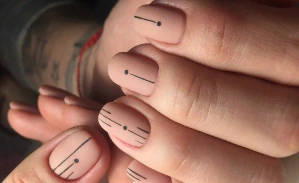 Нейтральні нюдові лаки – ідеальний варіант для манікюру з використанням ліній та смужок. На похмурому фоні чорні або золотисті лінії виглядають дуже вдало.