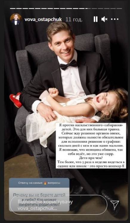 А ще відомий шоумен заявив, що неодноразово намагався знайти спільну мову з колишньою дружиною. За його словами, раніше Олена Войченко дозволяла дітям бачитись з їхнім татом. Проте, зараз жінка категорично проти відпускати їх до Володимира Остапчука.