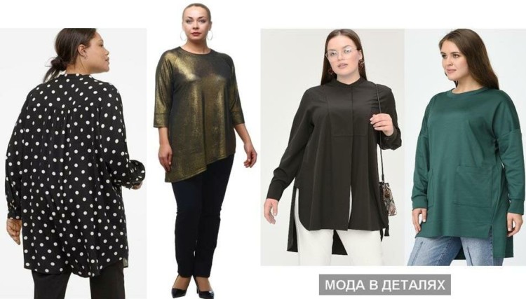 Як туніку зараз часто використовують сорочки оверсайз з наскрізною застібкою. Популярний фасон – коли спинка довше переду. Туніки найкраще виглядають з вузькими брюками, тоді фігура наближається до витягнутого прямокутника і виглядає вище і стрункіше.