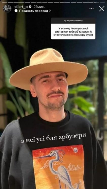 Нещодавно шоумен відреагував на гучну заяву своєї колишньої обраниці. Подробицями чоловік поділився в Instagram-stories. Олександр Еллерт дав коротку, але чітку відповідь. “У неї усі, бл*, арбузери”, – прокоментував чоловік. Також відомо, що під час війни шоумен намагався відновити спілкування з Ксенією Мішиною.
