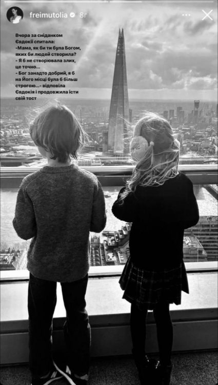 Нещодавно телеведуча поділилась рідкісним кадром з молодшими дітьми. Чорно-білу світлину вона запостила в Instagram-stories. Перед камерою син та донька Ольги Фреймут постали та тлі красивих краєвидів. “За сніданком Євдокія запитала: “Мамо, якби ти була Богом, яких би ти людей створила?”. Я б не створювала злих, це точно…Євдокія відповіла: “Бог занадто добрий, я б на Його місці була б більш строгою”…і продовжила їсти свій тост”, – прокоментувала фото Ольга Фреймут.