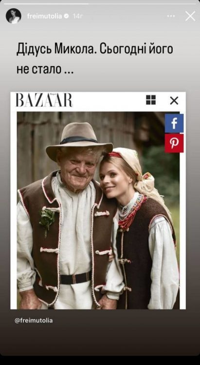 На фото Ольга Фреймут ніжно пригорнулась до дідуся, продемонструвавши щасливу усмішку. Рідна людина телеведучої теж позувала в українському вбранні. За словами Ольги Фреймут, з дідусем в неї пов’язано дуже багато приємних спогадів. Втрату рідної людини телеведуча переживає вкрай важко.
