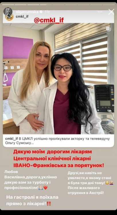 Зірка українського шоу-бізнесу заявила, що потрапила до місцевої лікарні. Однак, там акторці зовсім не допомогли. Ользі Сумській стало лише гірше. “Ви навіть не уявляєте, в якому я стані була три дні тому після жахливого отруєння в Австрії. Я не отримала належної медичної допомоги, попри те, що мої аналізи показували, що мені потрібна була серйозна терапія. Крапельниці, які мені ставили, не допомогли, і те лікування не привело до полегшення мого стану”, – відверто розповіла жінка.