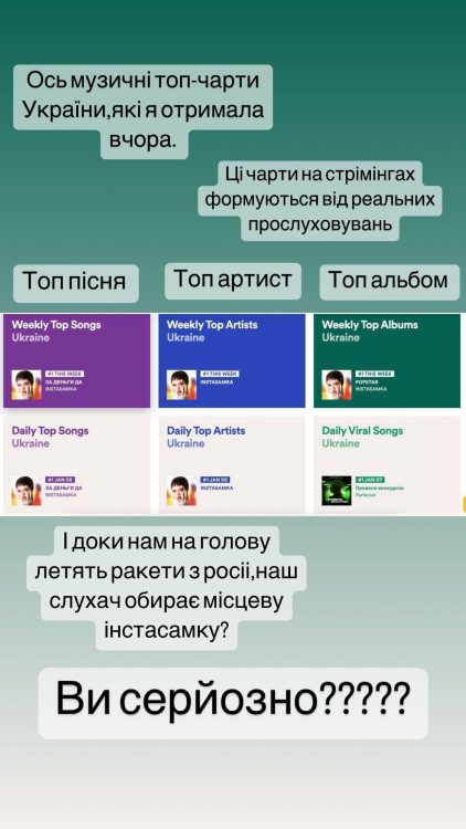 В Instagram-stories вона показала, що серед трендів в українських чартах й досі можна зустріти INSTASAMKA чи інших артистів з РФ. Така ситуація вкрай обурює Олю Цибульську.