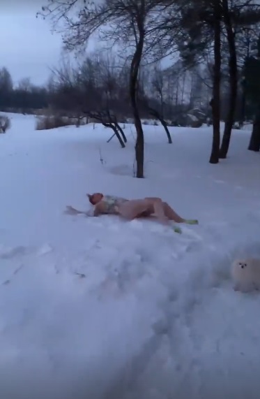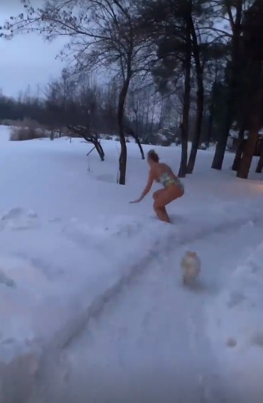 В Instagram-stories Оля Полякова запостила знімки, на яких позує серед великих кучугур снігу. Жінка зізналась, що не боїться холоду й морозу. На фото вона стрибає в замет й обтирає своє оголене тіло снігом.