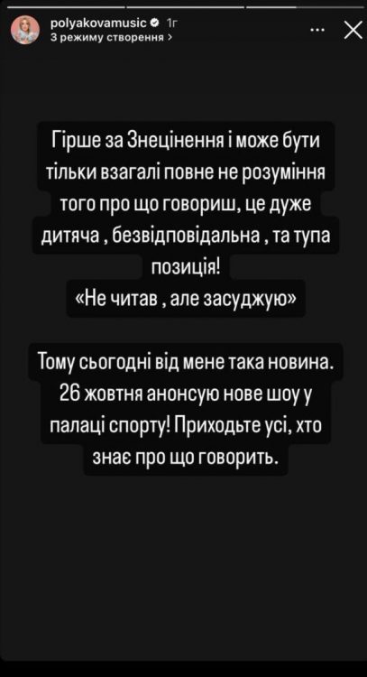 Співачка заявила, що слова кухаря її неабияк обурили. Вона різко відповіла Євгену Клопотенку та прокоментувала свою творчість під час війни. “Гірше за знецінювання може бути тільки взагалі повне нерозуміння, про що говориш. Це дуже дитяча, безвідповідальна та тупа позиція! “Не читав, але засуджую”, — заявила Оля Полякова.