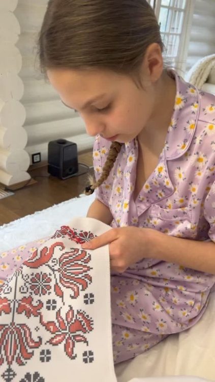 Перед камерою 11-річна Аліса з’явилась у піжамі з квітковим принтом. Дівчинка зосереджено вишивала рушник, демонструючи свій талант. Оля Полякова заявила, що дуже пишається своєю донечкою. Вона неабияк рада, що в дівчинки таке патріотичне хобі.