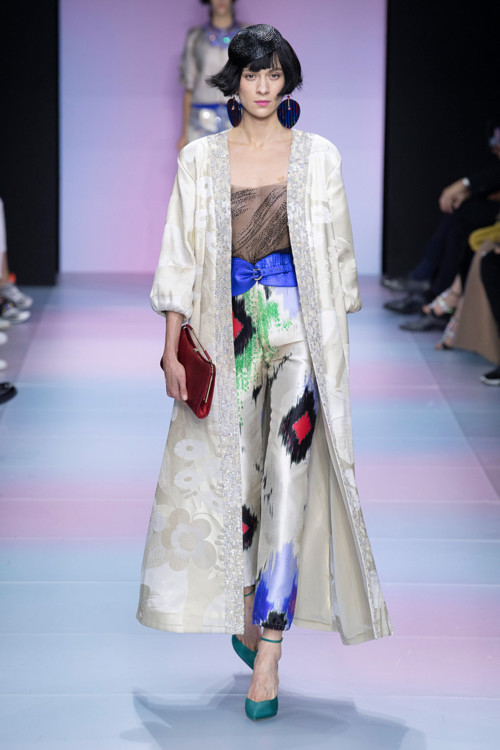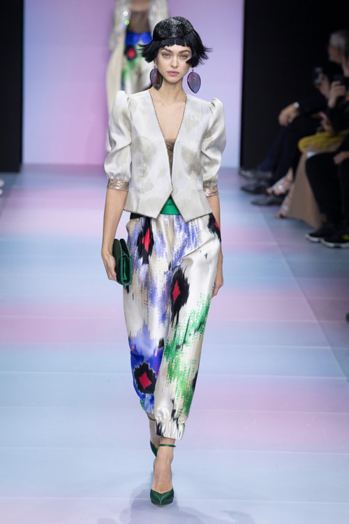 Основу нової кутюрної колекції маестро Армані склали витончені вечірні туалети та ідеально скроєні брючні костюми категорії power suit. Сукні з органзи і тафти щедро декоровані «дощиком» з бісеру, малюнками зі стеклярусу і об’ємними квітковими аплікаціями – увага до деталей це якраз про Armani Privé. Основним принтом нової колекції є орнамент ікат – східний візерунок з нерівними краями, який виходить завдяки особливій технології фарбування тканини. Він «розсипався» на штанах, сукнях, жакетах і навіть ґудзиках.