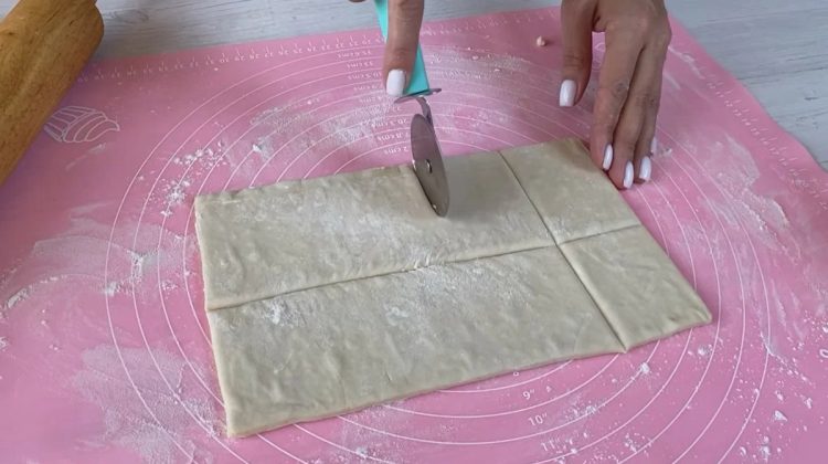 Листкове тісто ділимо на 8 рівних шматочків. Кожен із них злегка розкочуємо за допомогою качалки (буквально 1-2 прокати з легким натисканням). Згортаємо навпіл і по коротких краях закріплюємо. Тісто можна використовувати як дріжджове, так і бездріжджове на ваш смак.