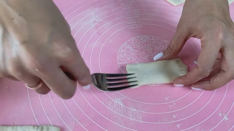 Для кращого скріплення та красивого бортика по короткому краю проходимо виделкою. Центр защипувати не потрібно!