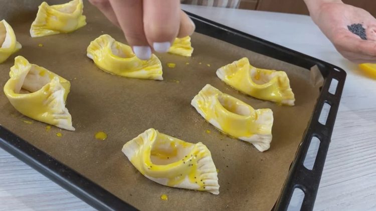 Тепер формуємо такі човники, перекладаємо їх на деко, застелене пергаментним папером і змащуємо збитим яйцем. За бажанням можна зверху посипати їх кунжутом чи маком. Ставимо у розігріту духовку. Час випікання має бути вказаний на упаковці для тіста. Човники мають стати рум’яними.