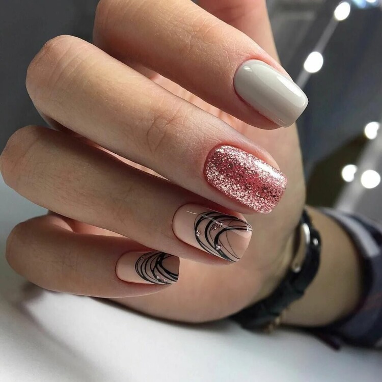 Для універсальних відтінків чудово підійдуть бежеві і нюдові кольори. Вони надають образу ніжності і жіночності. Для таких відтінків можна підібрати витончений декор у вигляді павутинки або втирки. Також можна виконати складну геометрію із застосуванням додаткових кольорів.