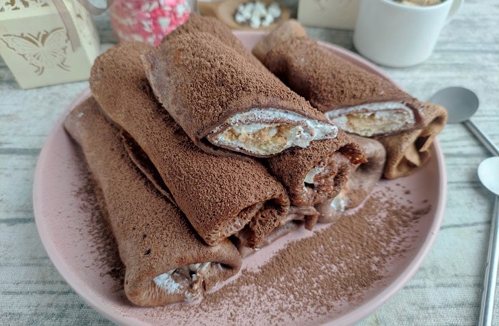 Загортаємо в рулетик та викладаємо на тарілку. За бажанням зверху млинці посипаємо тертим шоколадом або какао-порошком. Смачного!