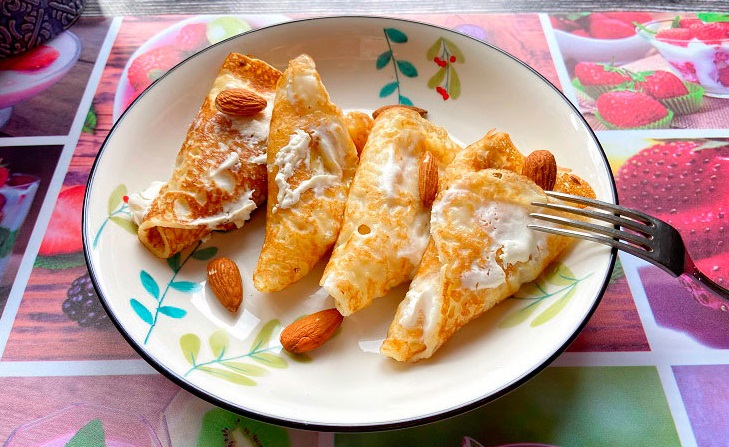 Такі млинці точно сподобаються Вашим дітям. Вони складаються з ніжної сирної начинки. Млинці відмінно смакуватимуть з гарячими напоями. Особливість їхнього приготування в тому, що млинці запікаються в духовці.