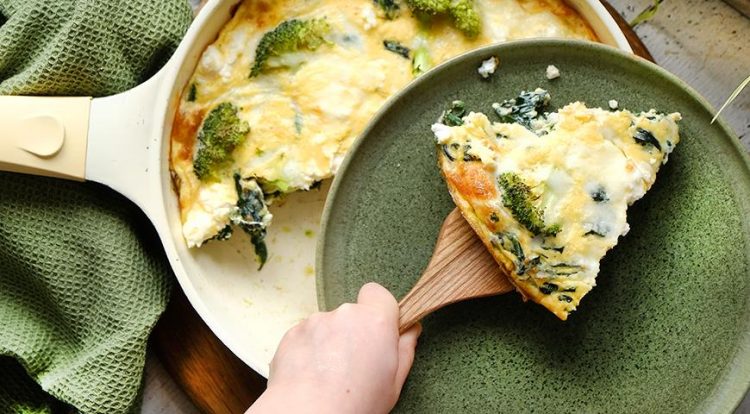 Також додаємо моцарелу. Перемішуємо. Цибулю й часник викладаємо на сковорідку та смажимо до м’якості. Додаємо шпинат. У сковорідку вливаємо яєчну суміш. Зверху викладаємо броколі. Солимо й перчимо за смаком.