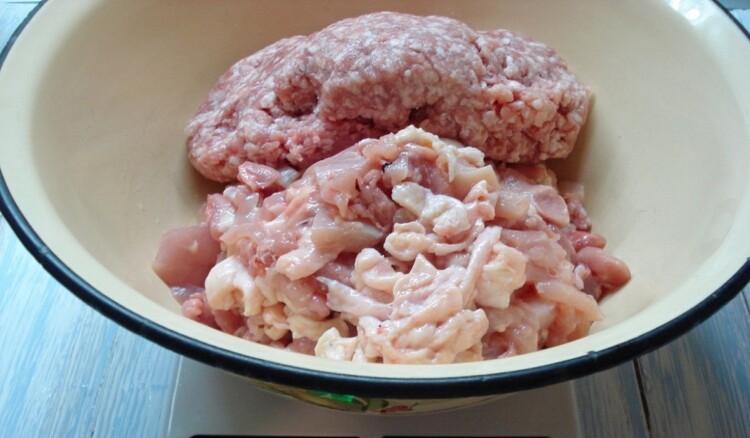 Приготуйте фарш зі свинини і курятини або купіть вже готовий. Змішайте обидва види з однією цибулиною, натертою або пропущеною через м’ясорубку.
