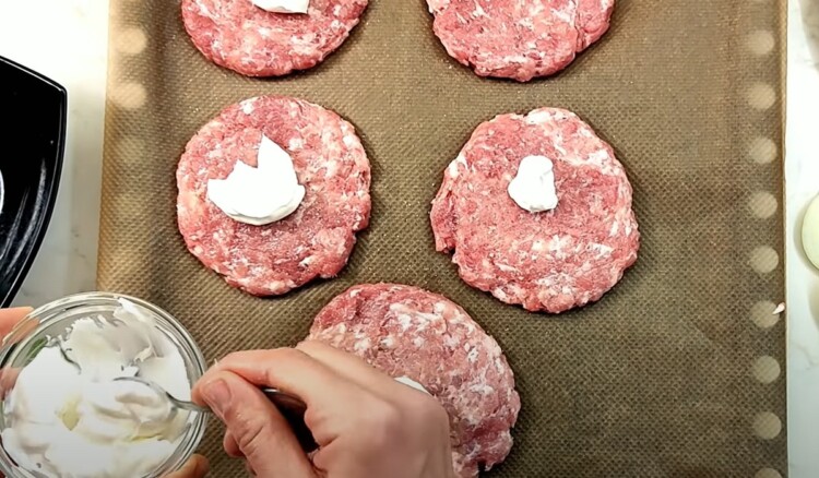 У фарш додайте сіль і перець. Викладіть його акуратними коржиками на змащене олією деко. На фарш викладіть по чайній ложці майонезу (або сметани). Це захистить його від пересихання.