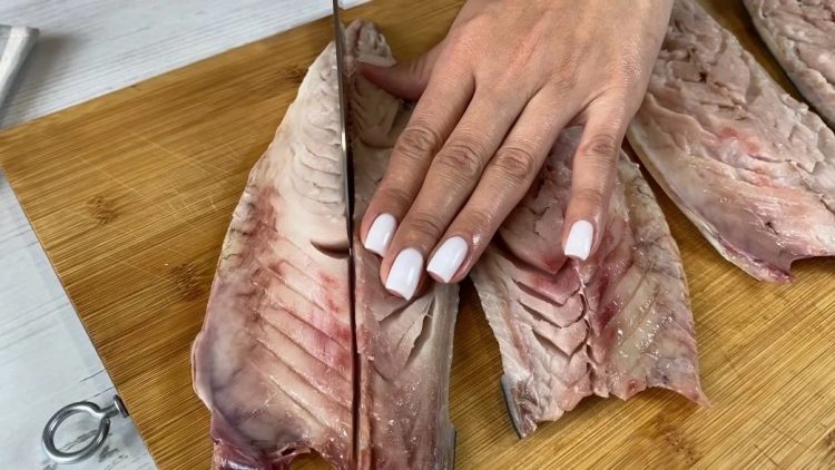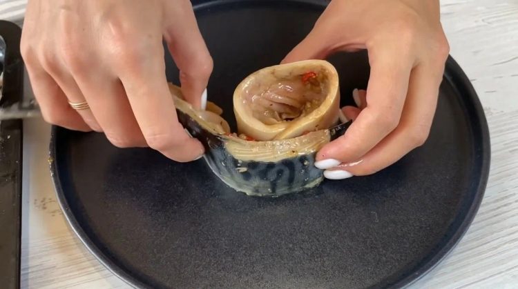 У скумбрії видаляємо голову, плавці, хвіст і нутрощі. З філе витягуємо всі кісточки, промиваємо шматочки під водою та обсушуємо паперовими рушниками. Далі кожне філе розрізаємо вздовж навпіл. Шматочки перекладаємо на лист або на велику тарілку внутрішньою стороною вниз, щоб не завітрилася.