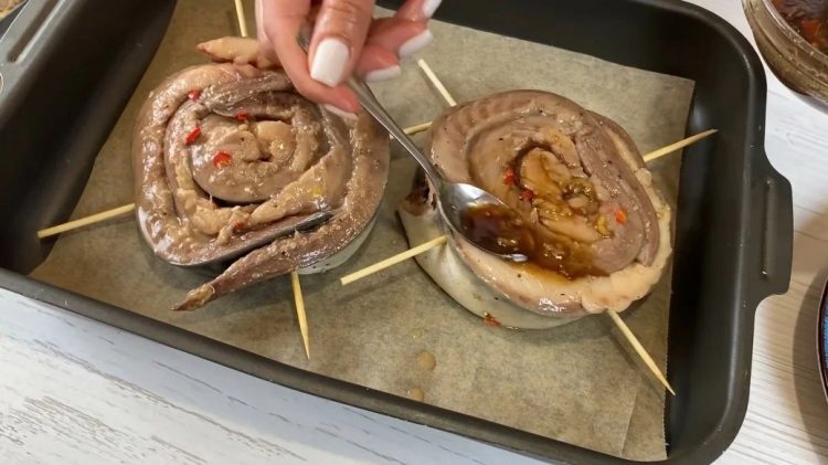 З тарілки беремо рулет за шпажки і перекладаємо у форму, застелену пергаментним папером. Зверху поливаємо маринадом, що залишився. Ставимо випікатися до духовки на 30 хвилин.